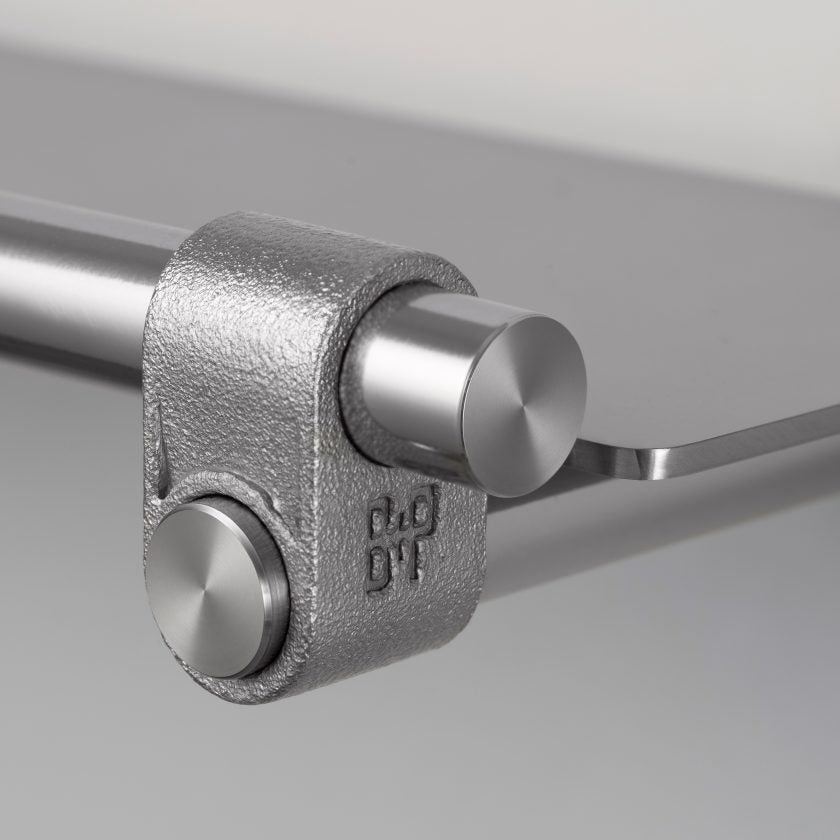 A small shelf made from solid metal. It features our signature rough-cast knuckle, hand polished solid metal bar and a hand polished solid metal shelf. Suitable for all interior spaces, including bathrooms. Available in small and medium.