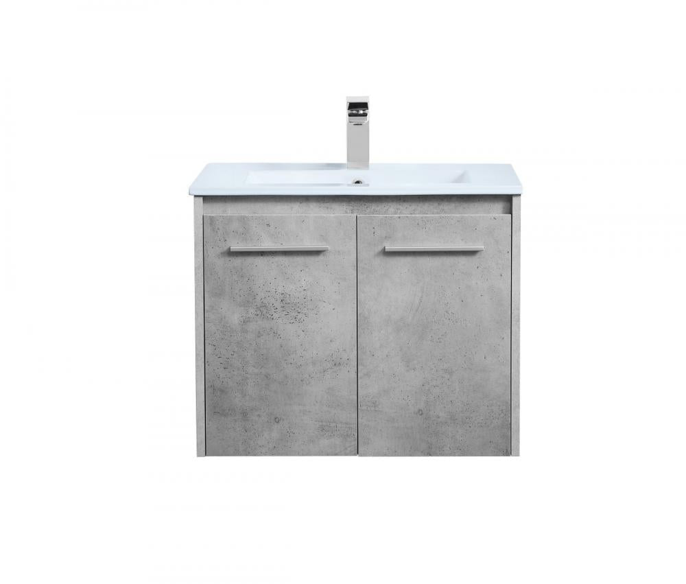 The contemporary simplicity of this floating vanity in a concrete grey finish will help open the space and add stunning modern flair to your bathroom or powder room. The open space below makes it easy to show off your tiles and to clean the floor with ease--it's also the perfect place for a hamper. Double doors open to reveal plentiful of storage pace to store all of your bathroom miscellany. The clean lines that permeate through the design will surely create a fresh look in your home.