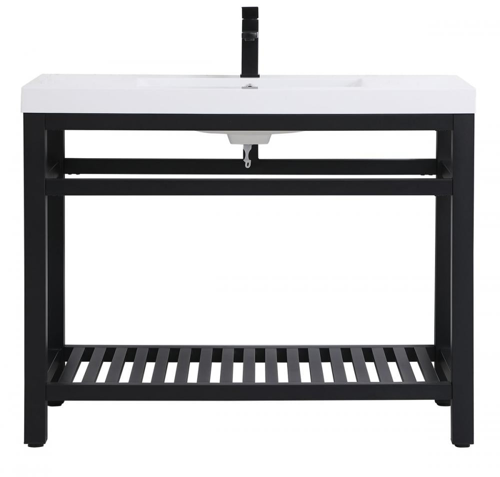 In true minimalistic spirit, this vanity shines with pared down elegance. Bold clean lines build up the metal vanity, creating a modern simplicity that adds visual liveliness and complements any bathroom or powder room. The bottom shelf lets you put away any extra towels or bathroom essentials, and its shining white undermount sink creates contrast against the finish. Its bold graphic style will create a contemporary style in your home.