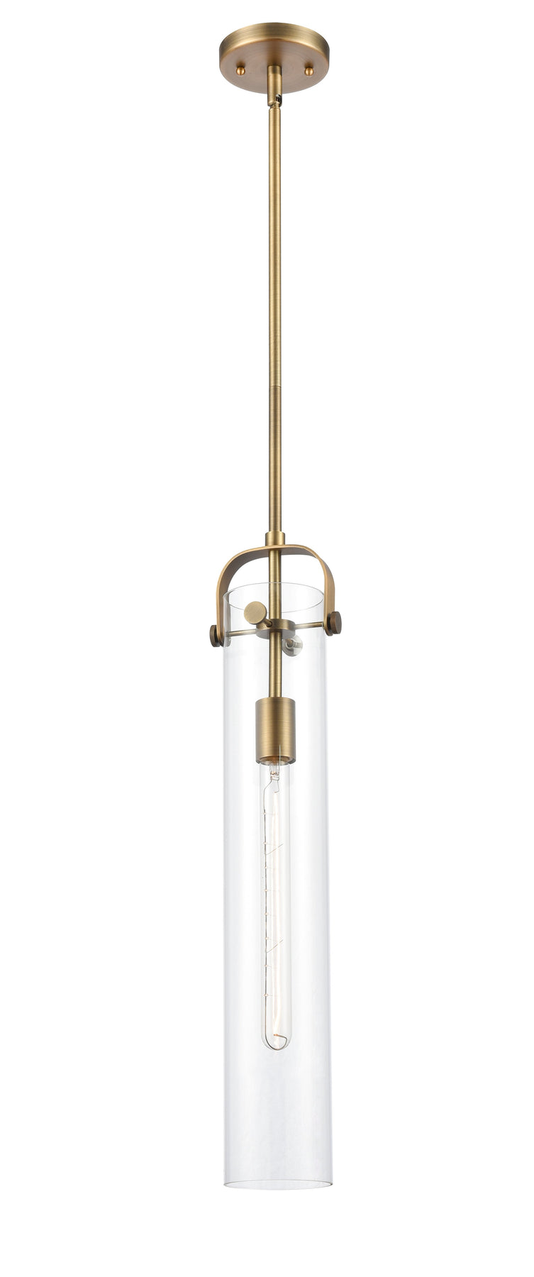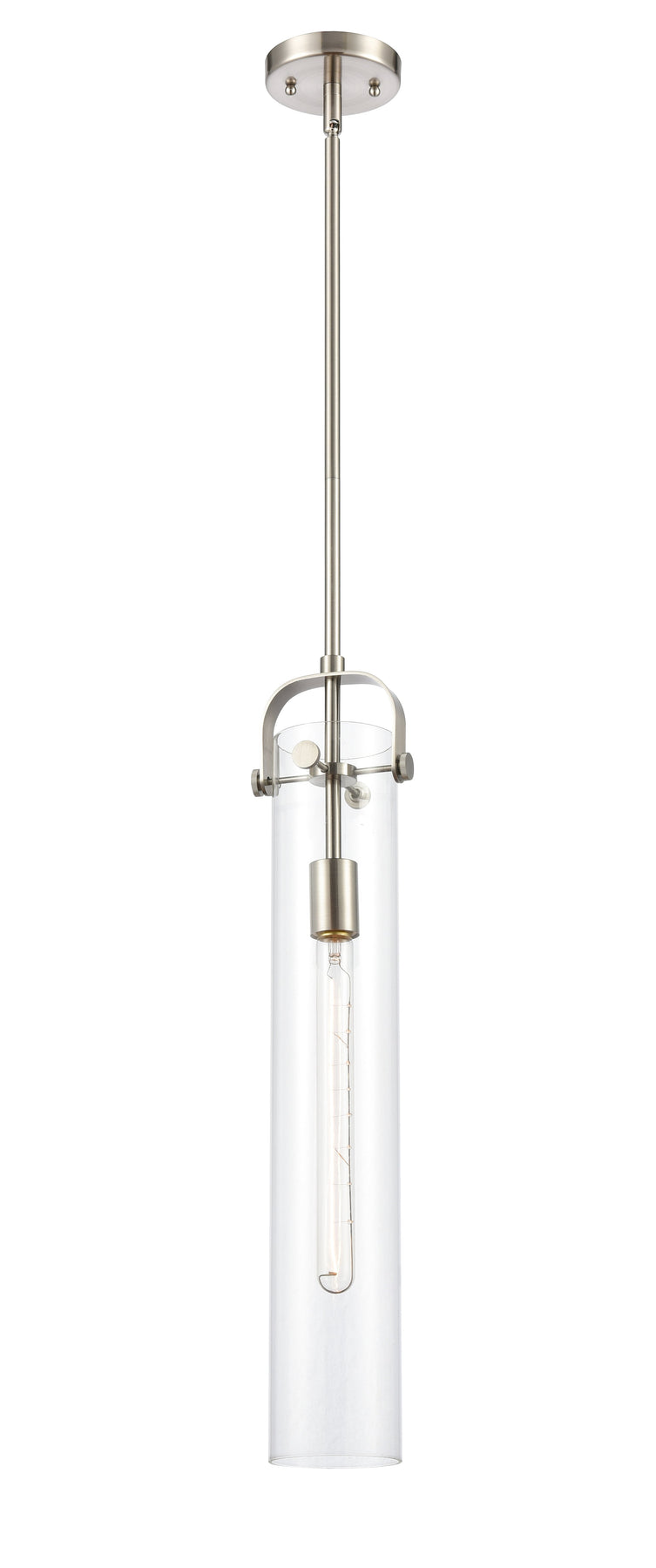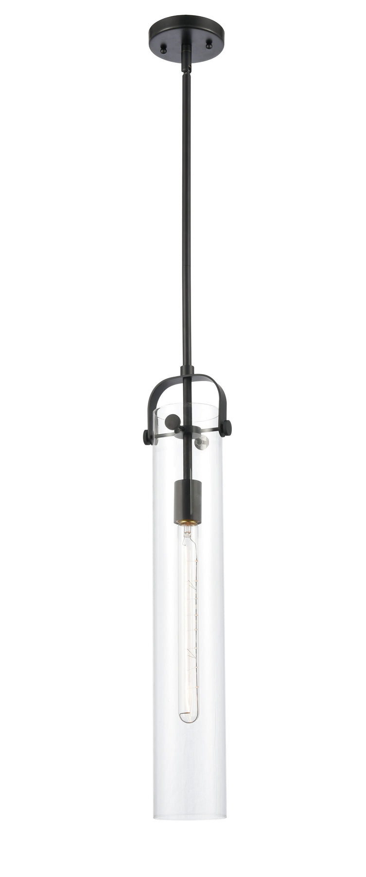 An elegant twist on industrial lighting, Pilaster boasts a metal frame with dramatic glass cylinders that are accentuated by machined metal fasteners. These fixtures are available with or without metal band detail in a complementary finish.