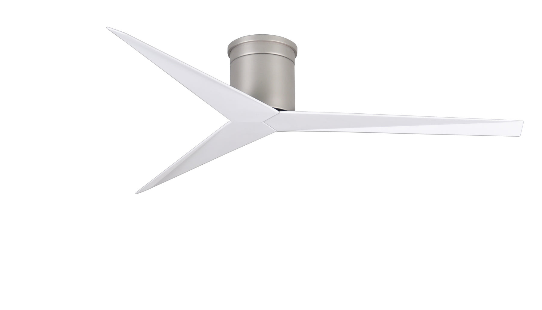 A vision of modern elegance and engineering, the Eliza-H ceiling-mount fan—designed by acclaimed Chicago architect Stephen Katz—seamlessly merges sculptural beauty with unparalleled performance. Its uniquely crafted blades are precision-engineered to maximize airflow with effortless efficiency, reducing drag and optimizing motor power for a smoother, quieter experience. Even at rest, the Eliza-H captivates with its striking minimalist geometry, a perfect harmony of form and function. Crafted from cast aluminum and heavy stamped steel and backed by a limited lifetime warranty, the Eliza-H is more than a fan—it’s a statement of innovation and sophistication. 21 possible fan finish/fan blade variations. Fan Finishes: Brushed Nickel, Gloss White, Matte Black. Blade Finishes: Barn Wood Tone, Brushed Nickel, Gloss White, Gary Ash Tone, Matte Black, Old Oak Tone, and Walnut Tone. DC Motor, Silent Motor, Handheld Remote, Wall Control and Damp Location.