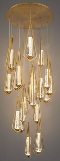 The Devotion multi-light luminaire sparkles brilliantly from twenty-one pendants composed of Radiance® Crystal Dust tapers held within triangular frames and installed on one round canopy. This dramatic luminaire creates an artful statement while providing ample lighting to surrounding spaces. Finishes are Aged Brass, Black, and Satin Nickel. Devotion sparkles brilliantly from twenty-one pendants composed of Radiance® Crystal Dust tapers held within triangular frames and installed on one round canopy. Integrated LED with Kelvin color temperature select of 3000K/3500K/ 4000K/5000K chosen at the time of installation.