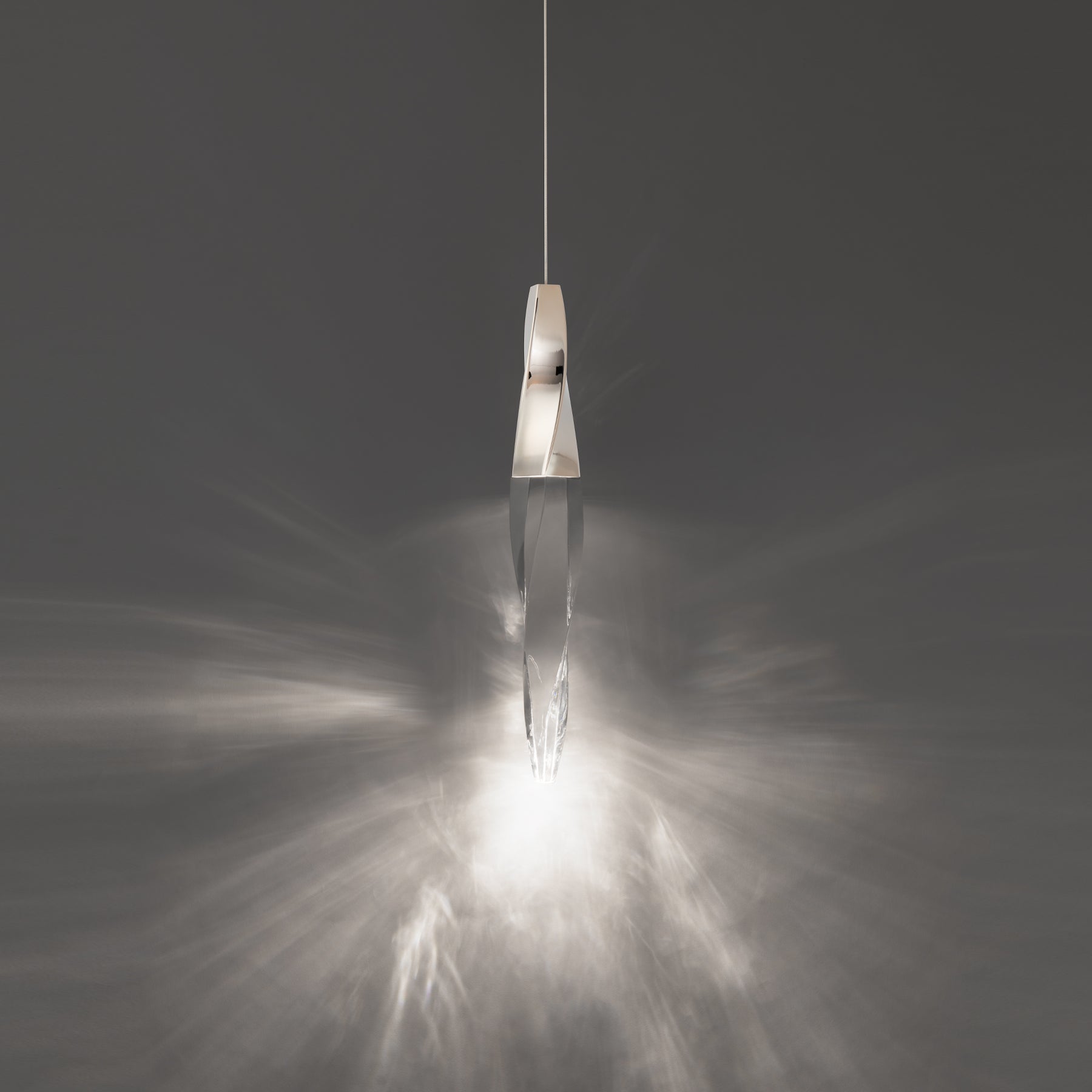 A subtle twist of luxe. Kindjal features exquisite Optic Crystal icicles that twist to a point from a cohesive metal casting, concealing a powerful LED that provide ample illumination. Stylish, textured materiality.