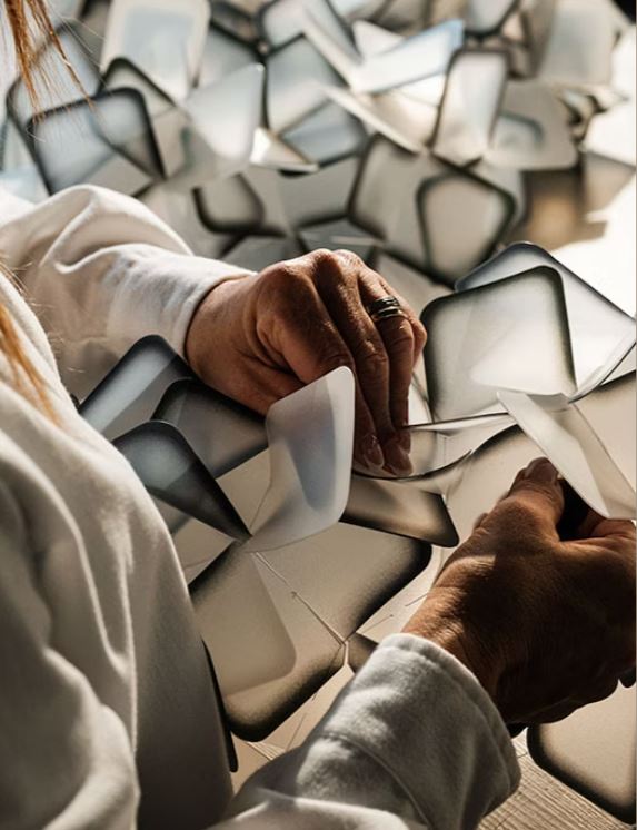 Clizia is a series of shapes fit together to create a perfect balance of reflections and transparencies. The lamp has taken note of natural forms, resembling a cloud that captures the first changing rays of morning sun, or a treetop filtering a play of light and shadows. All of the available versions marry aesthetics with functionality, featuring a magnetic system, connecting them to the ceiling (for the suspensions and applique) or the metal base (for the table and floor lamps). Clizia transforms a space into a landscape without overwhelming it.