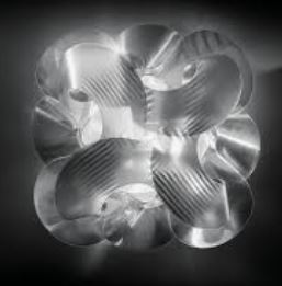 Fabula appears to be a long, silky piece of fabric wound around itself. The new, iridescent version for ceiling/wall is handmade with Lentiflex®. The medium version is 19" wide and 8" wide and the large version is 23.5" wide and 9.75" high. The medium version is three medium base bulbs and the large version is five medium base bulbs. The are crafted with a magnetic hanging system.