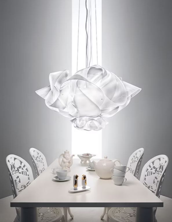 Fabula appears to be a long, silky piece of fabric wound around itself. The new, iridescent suspension version is made from Lentiflex®. The medium version features 3 light sources and the large version features five light sources that make it perfect for illuminating large spaces. The medium version is 19" wide and the large version is 23.5" wide.