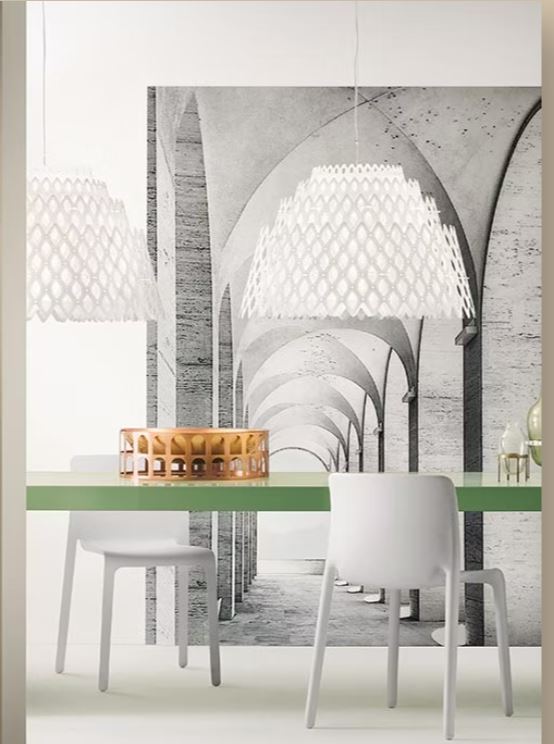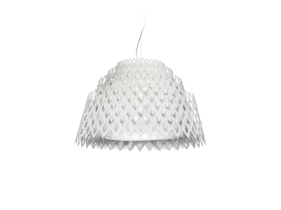Charlotte was created from a world of illusion, from the challenge of turning a two-dimensional element infinitely multiplying shapes. The light resembles that of waves pulling away from the shore, leaving little illuminated drops behind. Charlotte’s sculptural shape seems to be molded from a singular, industrious frame, much like honeycomb with its impalpable elements. Its concentric, hexagonal shapes allow for unending views. Illuminated with four medium bulbs. Finish is white with a transparent wire. The piece is 31.25" wide.