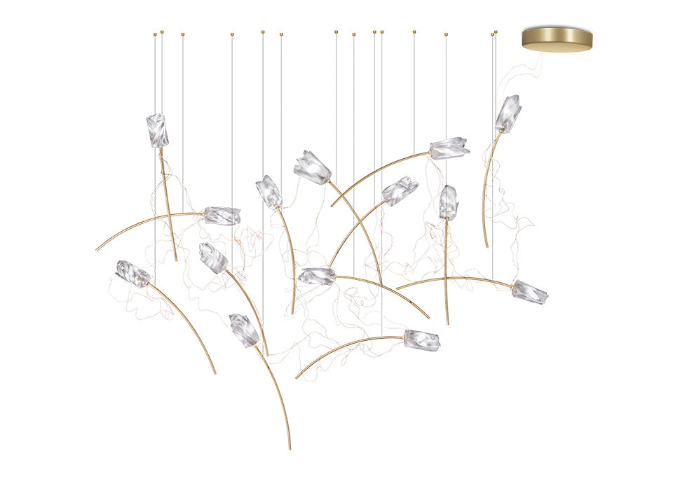 Imaginative, elegant, weightless. Tulip literally adorns spaces with floating blossoms that have been hand molded according to Slamp’s methods, making each unique. The almost invisible cables hold the suspended flowers that bloom from brushed brass stems; each is prepositioned at specific angles to create the sense of natural morphology. Every tulip is connected to the next through a series of intricately woven copper wires conducting low-voltage electricity. The collection features plug & play configurations of 14 flowers that can be installed according to personal tastes and the available space. The LED light sources are included and can be replaced autonomously.